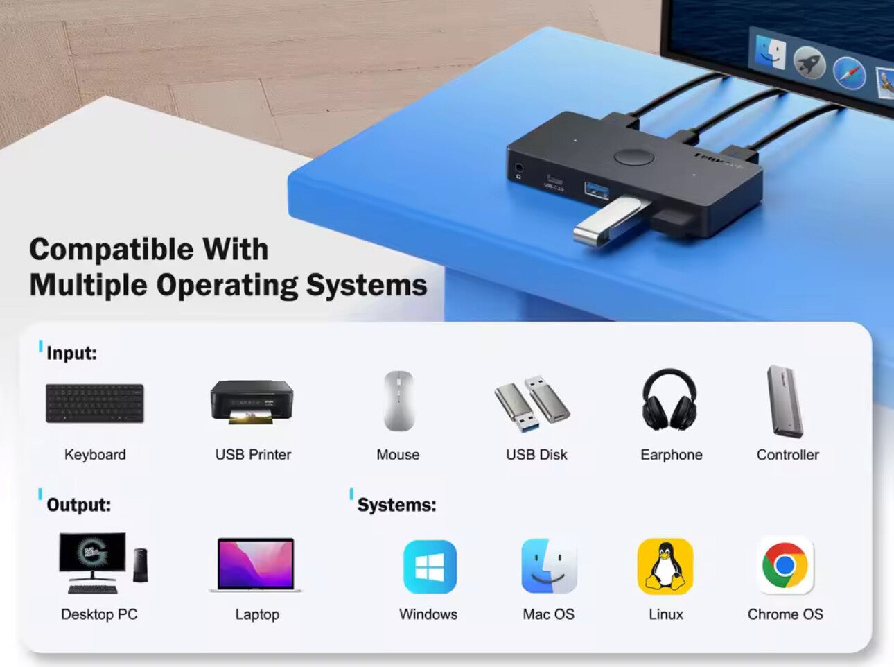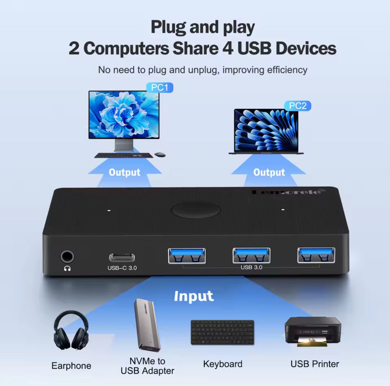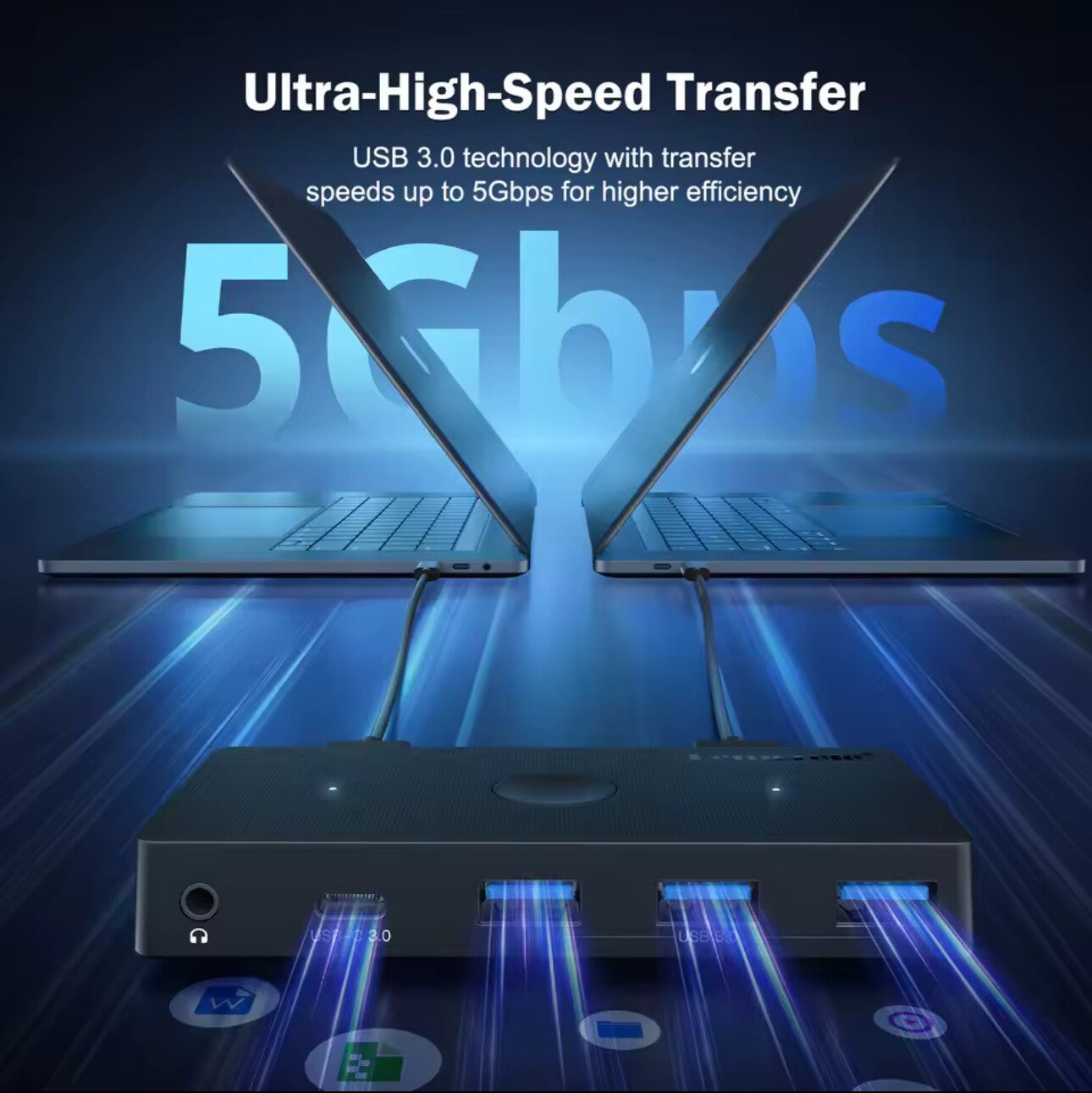 De Lemorele H100 USB 3.0 KVM-schakelaar maakt het eenvoudig om één set toetsenbord, muis en USB-apparaten te delen tussen twee computers. Met één druk op de knop wissel je razendsnel tussen PC’s — zonder kabels los te koppelen. Dankzij USB 3.0-technologie biedt de switch een overdrachtssnelheid tot 5 Gbps, 10× sneller dan USB 2.0. Volledig plug & play, geen drivers nodig, en compatibel met Android, Windows, macOS, Linux en Chrome OS. Ideaal voor werkplekken, kantoren of thuisgebruik. Compact, efficiënt en betrouwbaar – de perfecte oplossing voor wie slim wil schakelen tussen apparaten.