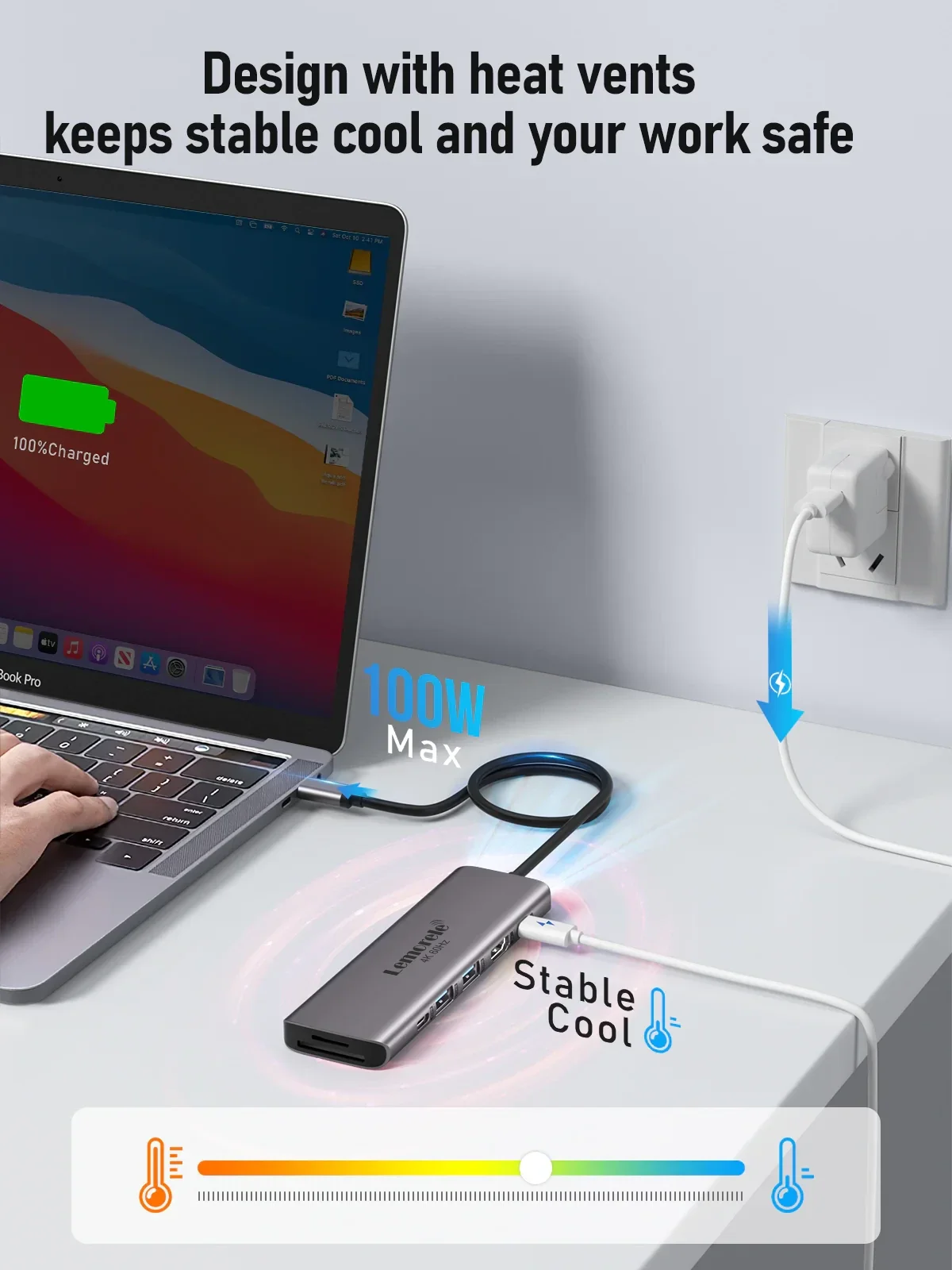 De Lemorele TC45 7-in-1 USB-C Hub combineert kracht, snelheid en veelzijdigheid in één stijlvol en compact ontwerp.