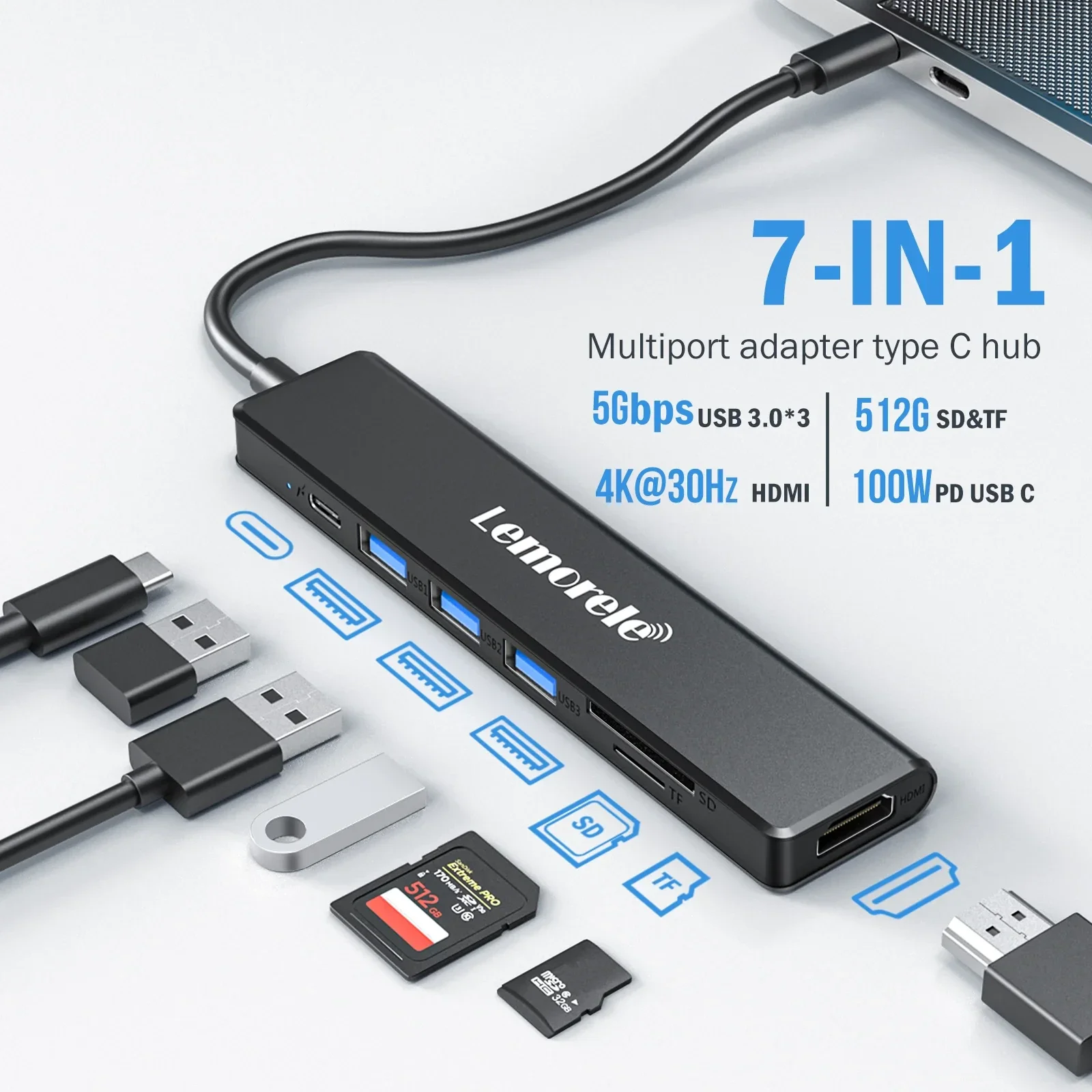 Lemorele TC90 USB-C Hub 7-in-1 – 100W PD – 4K HDMI