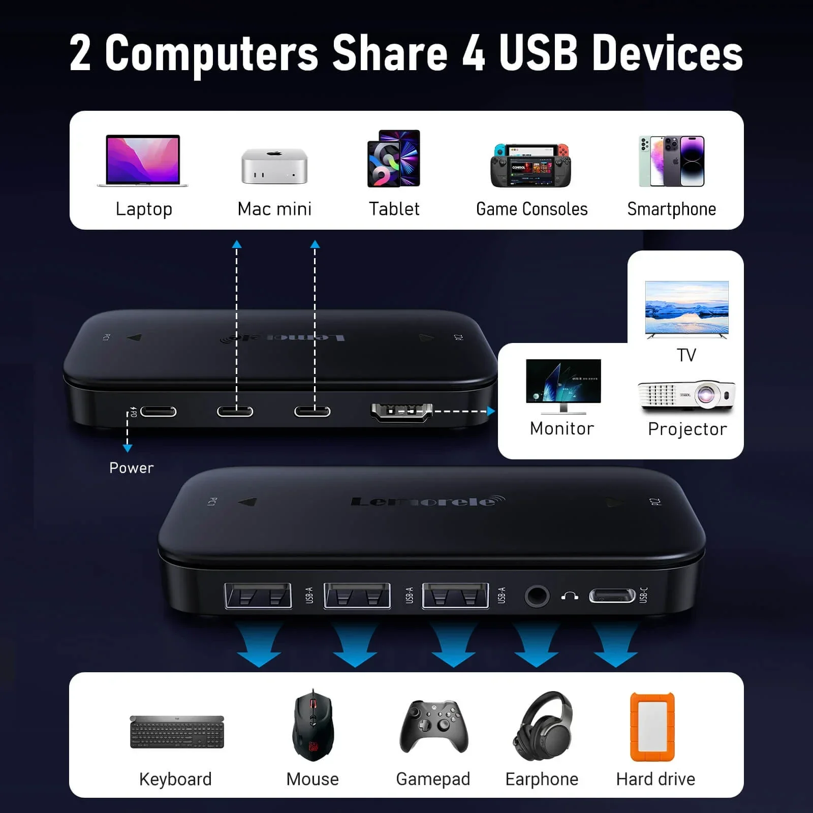 De Lemorele H200 USB-C KVM Switch stelt je in staat om twee laptops of computers te bedienen met één monitor, toetsenbord en muis. Met één druk op de knop schakel je direct tussen apparaten, zonder kabels te wisselen.